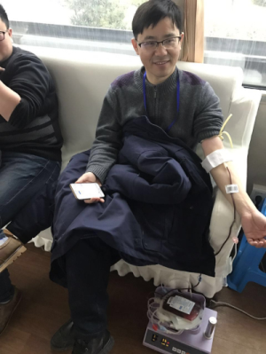 “小湯,今天你又來啦,這次可不能再暈倒喔”,正坐在椅子上采血的我見到本部門的小湯進(jìn)來檢查血樣就與他開玩笑,小湯也不示弱“去年是第一次,沒有經(jīng)驗(yàn),現(xiàn)在讓我站著獻(xiàn)也沒事”,小湯躺下身子繼續(xù)說“我比較胖,今天抽400CC”,接近目標(biāo)時,小湯的額頭上滲出了些許汗珠,醫(yī)生見狀,忙問“覺得不舒服嗎”,小湯堅定回答:“沒事,抽到400CC”。